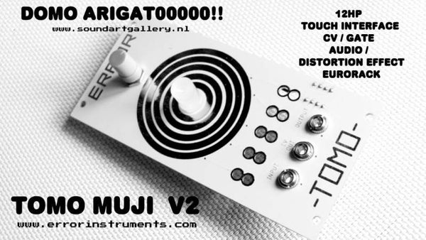 TOMO MUJI V2 is an experimental touch interface for Different type of purpose It can be a touch Interface for CV . / gate / trigger / or audio ./ It can also be a distortion./ It has one input and two outputs . One potential meter. To control the inputs . But also the amount of the output . In the middle there is a difference Circles all circles have Different connection points And your body make it capacitive touch. The LED will be blink sometimes but not all the time. There are 10 rounds spots This one can be used for a crocodile clips if you want to connect something else . This model Is made of one pcb the new V2 Has more protections if it's about the chip and diode The maximum Voltage that comes out is 7v+ For more information check the demonstration videos